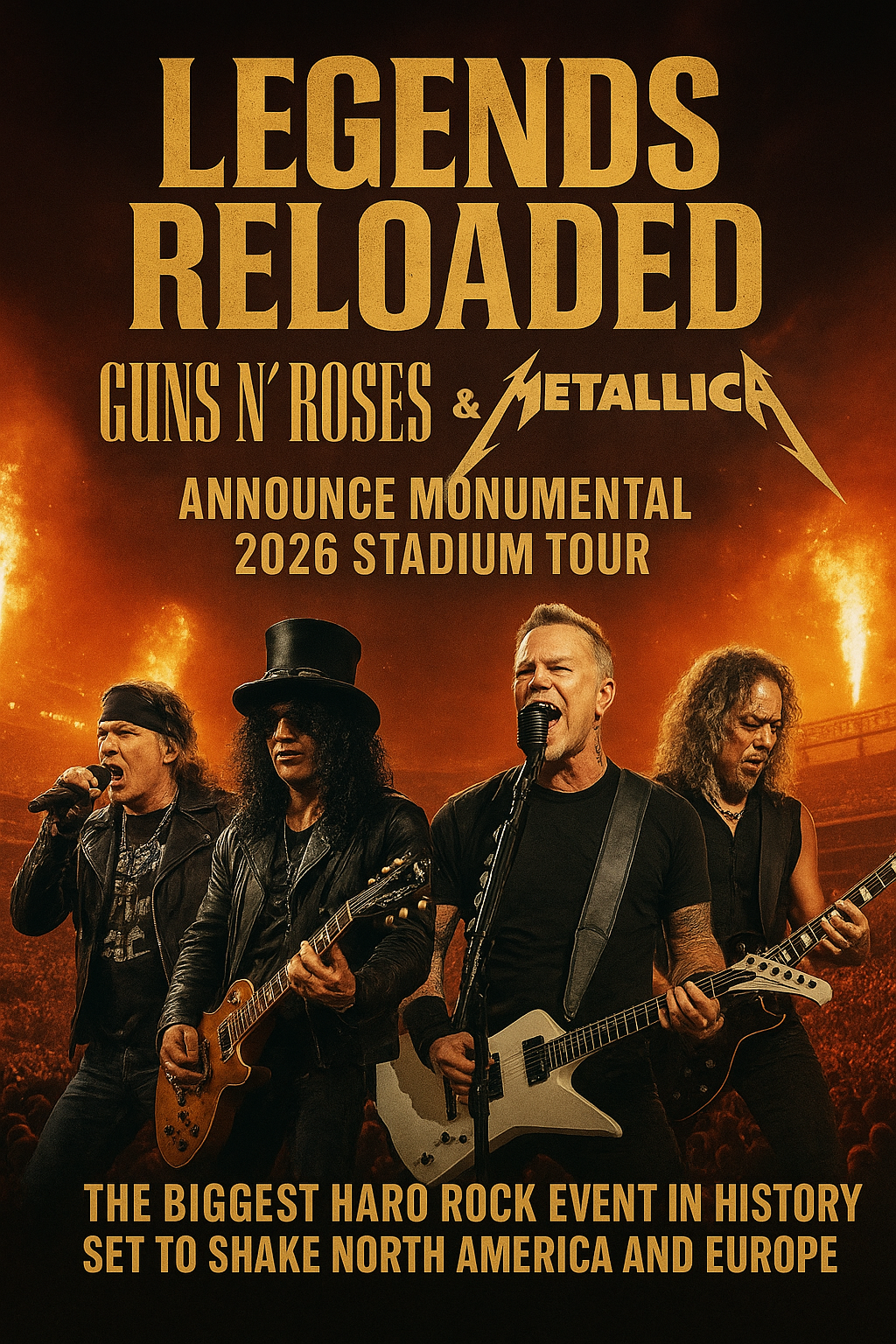 In an announcement already sending shockwaves across the music world, Guns N’ Roses and Metallica have confirmed a joint 2026 stadium tour—an unprecedented union of two of the most powerful forces in rock history. Titled **“Legends Reloaded: The World Burns Tour,”** the massive run is being hailed by promoters as the *largest hard rock event ever staged*, bringing together decades of influence, attitude, and pure musical firepower.