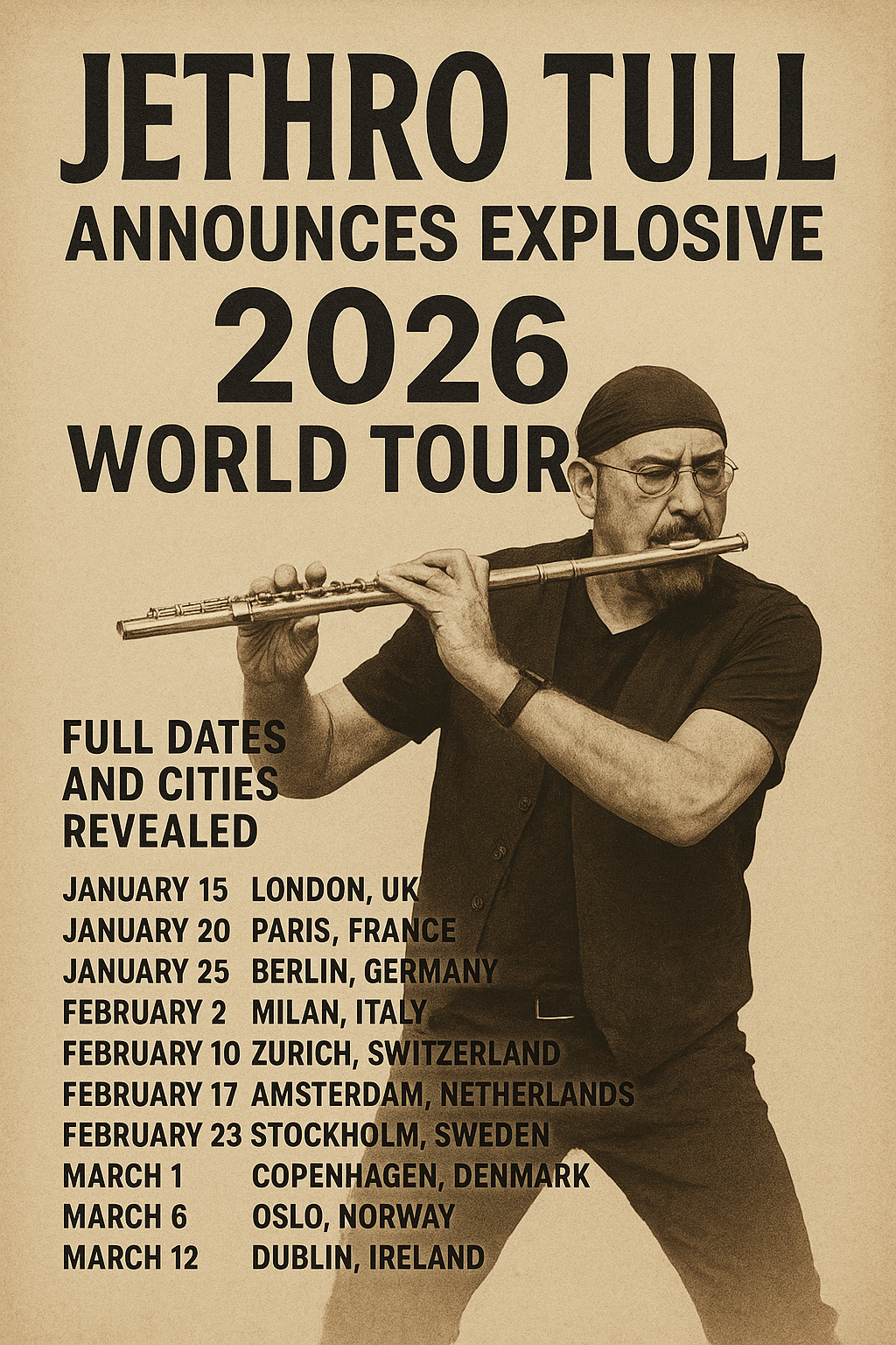 Legendary British rock band **Jethro Tull** has officially announced their long-awaited **2026 World Tour**, marking one of the most ambitious live ventures in the group’s storied career. The tour, titled *“A Passion Play Reborn,”* will span **five continents** and feature over **60 concert dates**, beginning in **London on April 10, 2026**, and concluding in **Tokyo on December 14, 2026**.