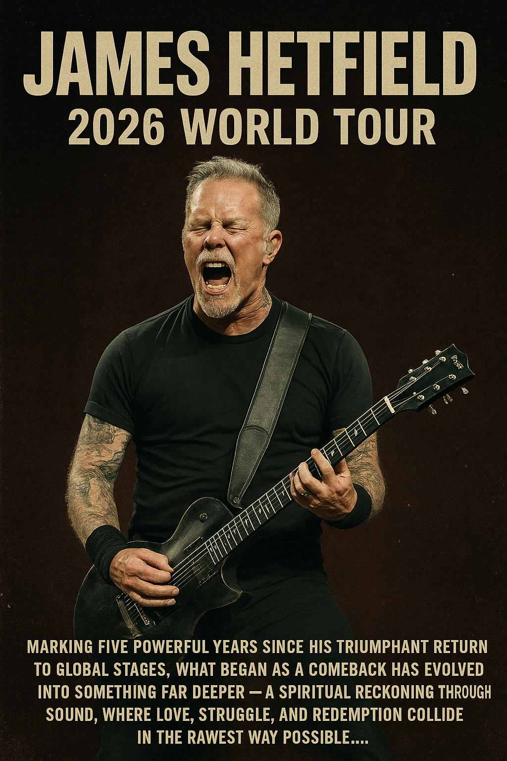 Metal icon **James Hetfield** has officially announced his **2026 World Tour**, marking five powerful years since his triumphant return to global stages. What began as a long-awaited comeback has evolved into something far deeper — a **spiritual reckoning through sound**, where love, struggle, and redemption collide in the rawest way possible.