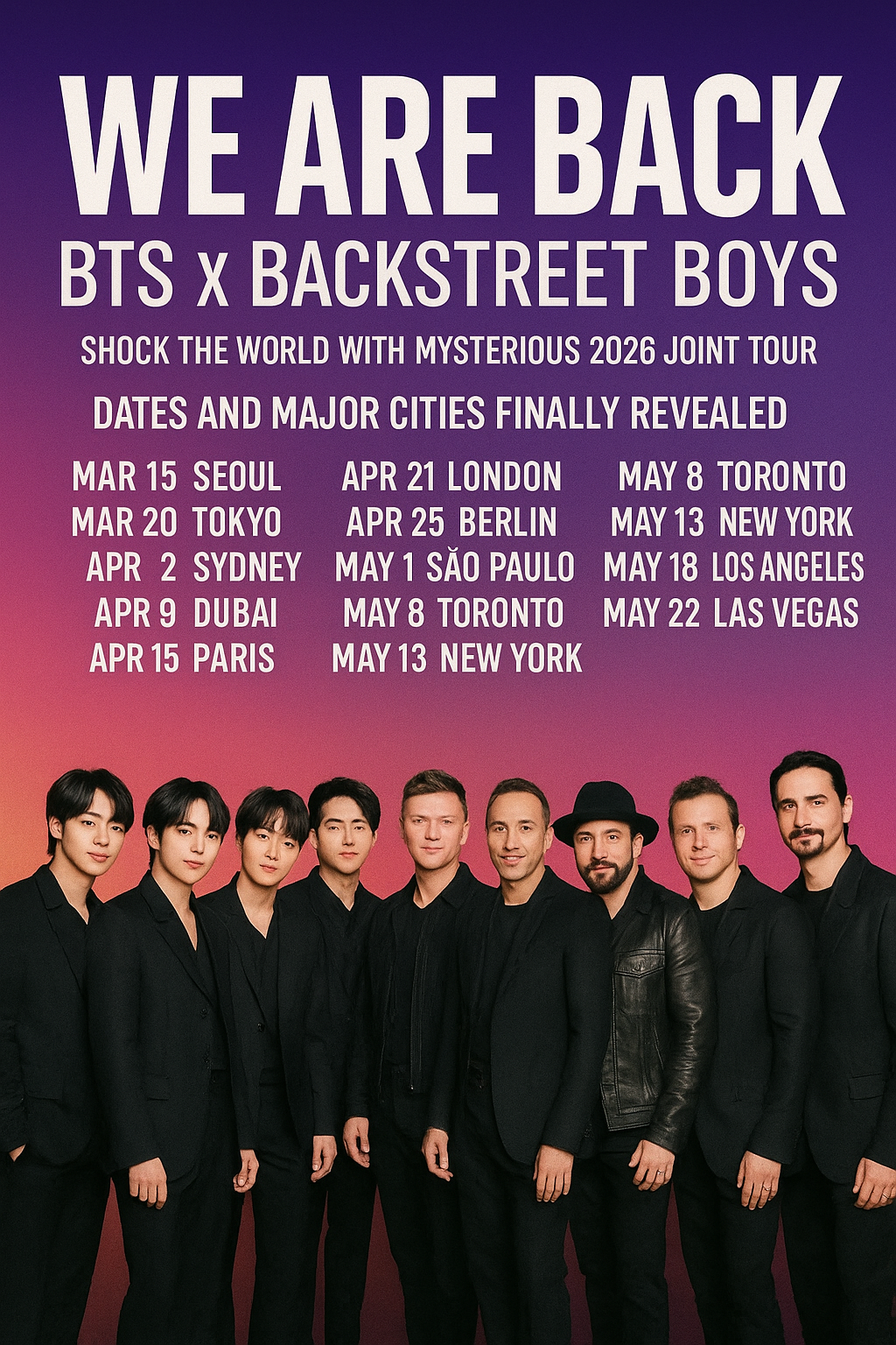In a move that has sent shockwaves through the global music scene, BTS and the Backstreet Boys have officially announced their *joint 2026 world tour*, titled **“WE ARE BACK”** — a cross-generational celebration that promises to unite fans from every corner of the world. The unexpected collaboration between the K-pop icons and the ‘90s pop legends marks one of the most ambitious and talked-about tours in modern music history.